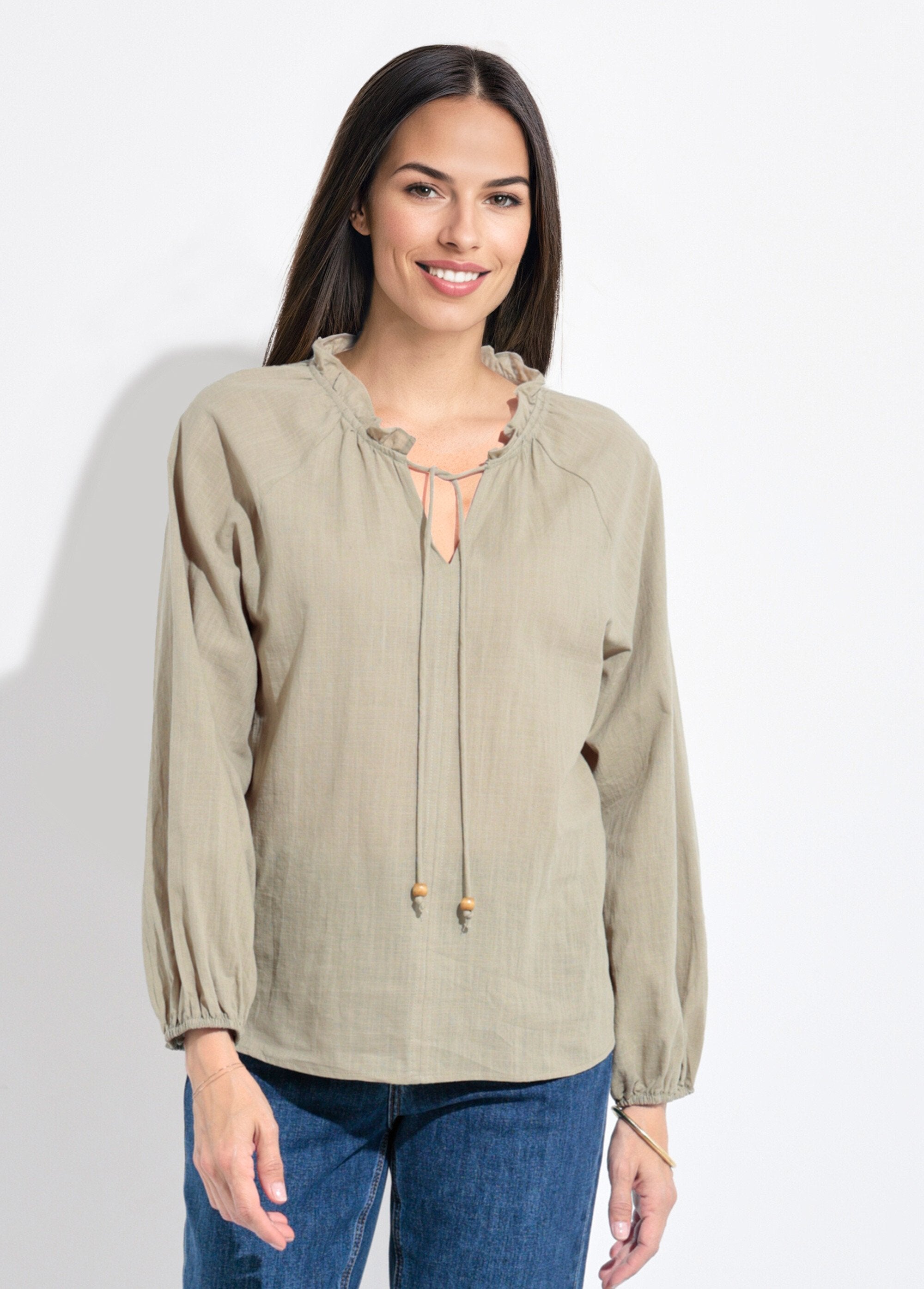 Blusa_holgada_con_cuello_en_V_y_lazo_Caqui_FA1_slim Blusa_holgada_con_cuello_en_V_y_lazo_Caqui_DO1_slim