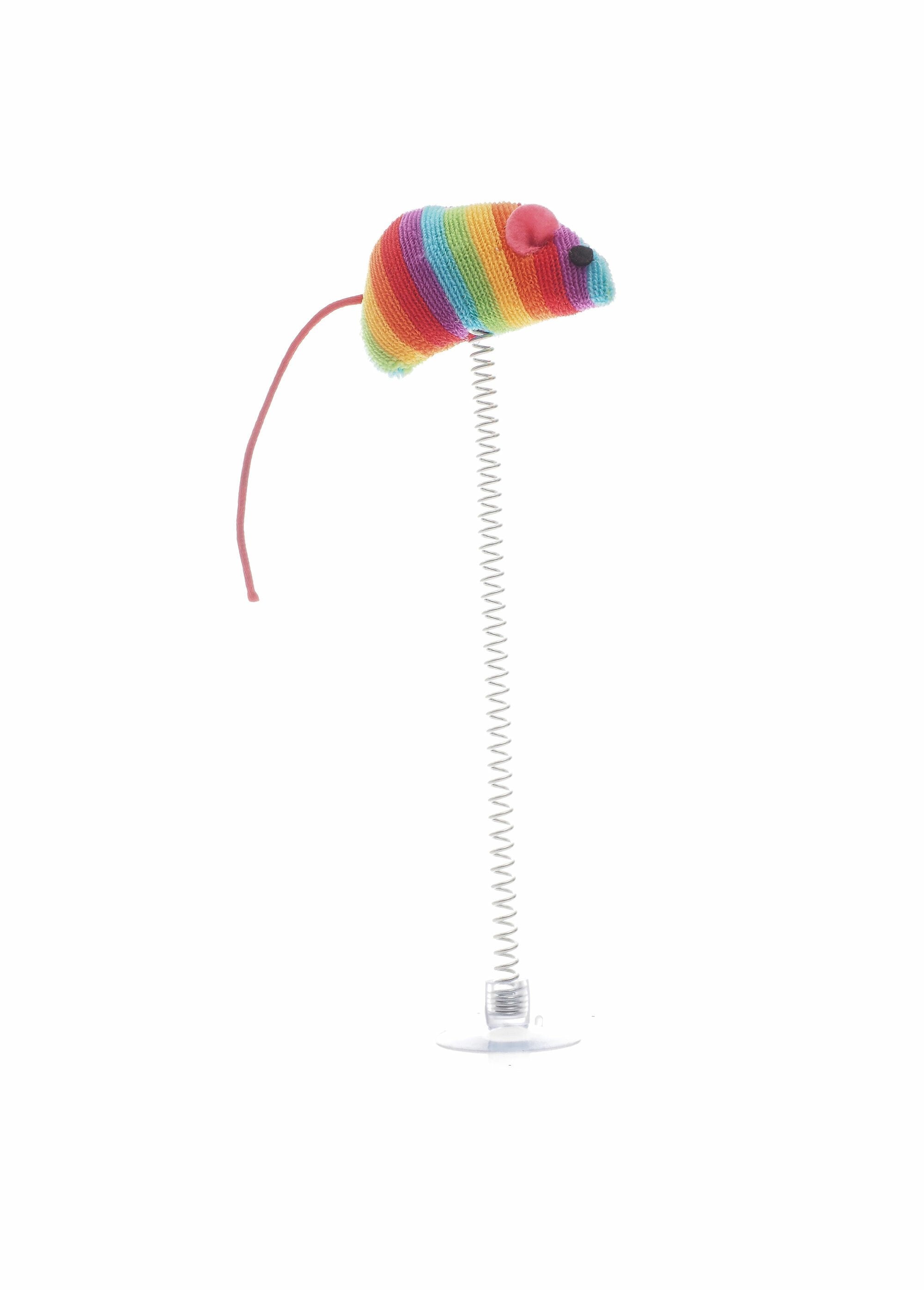 Este ratón de cuerda multicolor, montado sobre un muelle con ventosa, es el juguete perfecto para despertar el instinto cazador de su gato. Fácil de colocar en una ventana, una pared o incluso un frigorífico, proporciona horas de entretenimiento y diversión. El movimiento de rebote del ratón captará la atención de su felino, estimulando su necesidad natural de jugar. Esencial para el bienestar de su gato, este juguete interactivo le ayudará a mantenerse activo y feliz durante todo el día.